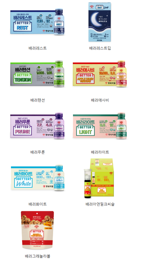 배러(BETTER)는 동화약품이 선보인 퍼스널 건강 케어 브랜드입니다. 단순히 건강에 좋은 제품을 넘어, 맛있게 즐길 수 있는 건강식품이라는 점이 가장 큰 특징입니다. 첫 출시 당시에는 ‘배러라이트’, ‘배러화이트’ 두 가지 제품으로 시작했지만, 지금은 더 많은 제품군으로 확장되며 라인업이 다양해졌습니다. “맛있어서 GOOD, 건강해서 BETTER”라는 슬로건처럼, 일상 속에서 간편하게 건강을 챙길 수 있는 제품을 지향하고 있습니다.