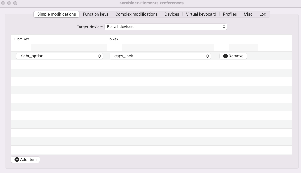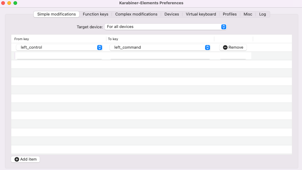 Karabiner 실행 후 Simple Modifications 탭에서 다음과 같이 설정합니다.