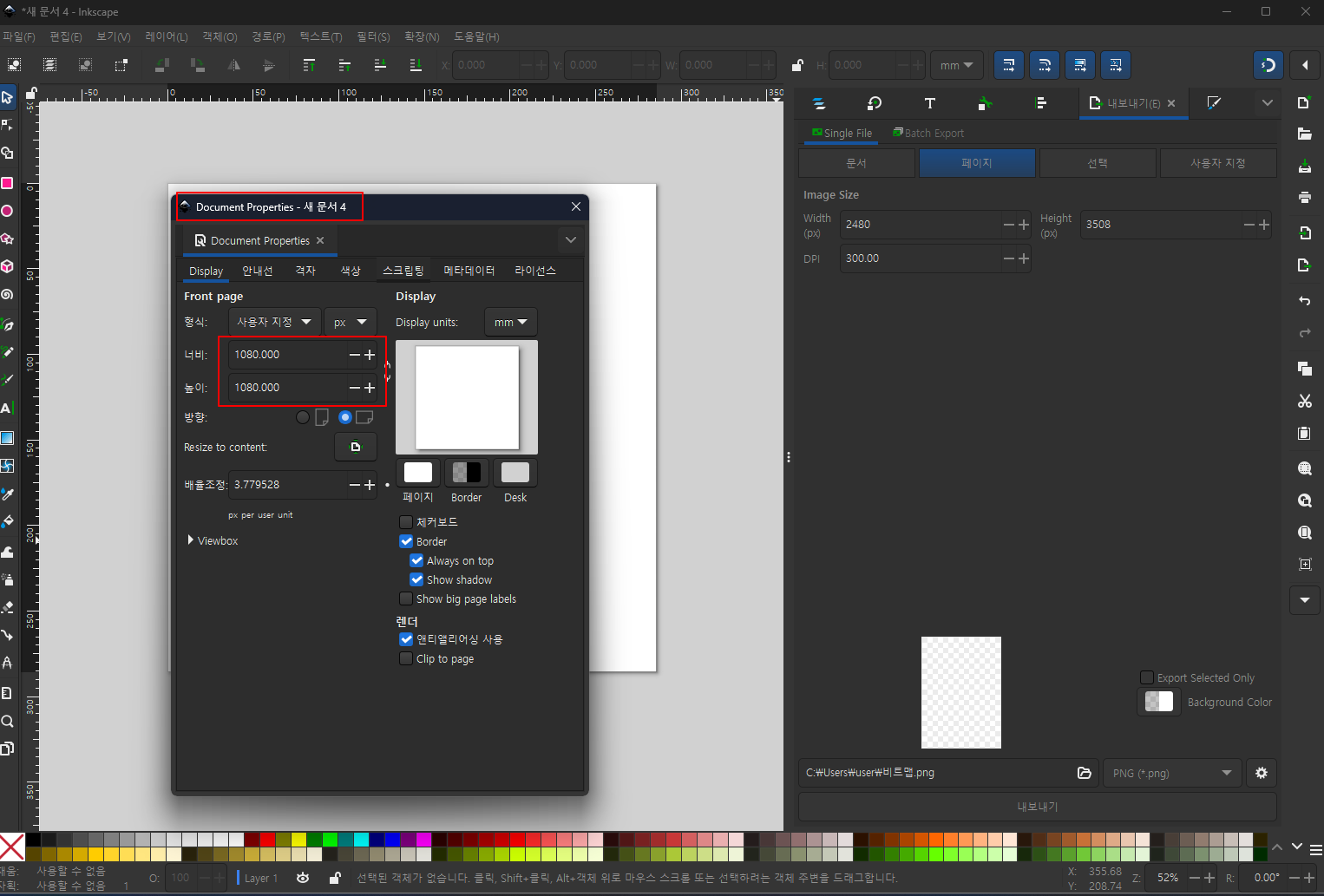 - 상단 메뉴 → 파일 → 문서 속성 (Shift+Ctrl+D)