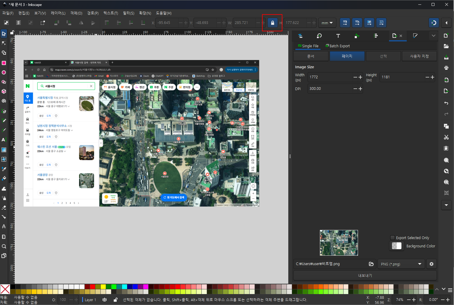 - 캡처한 이미지 복사(Ctrl+C) → Inkscape 화면에서 붙여넣기(Ctrl+V)